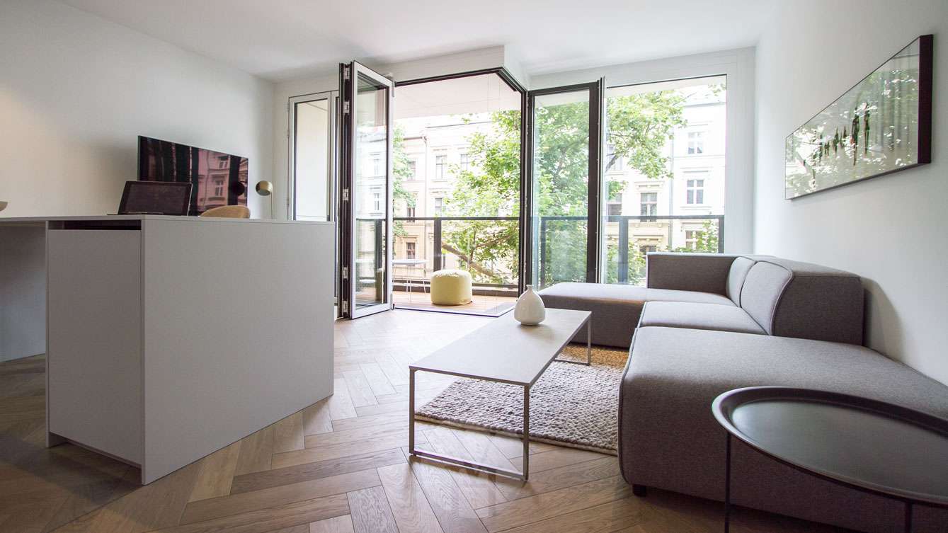 Die hochwertig möblierte 2-Zimmer-Wohnung aus dem Neubau von 2019 befindet sich im 2. Obergeschoss und ist modern und einladend eingerichtet.