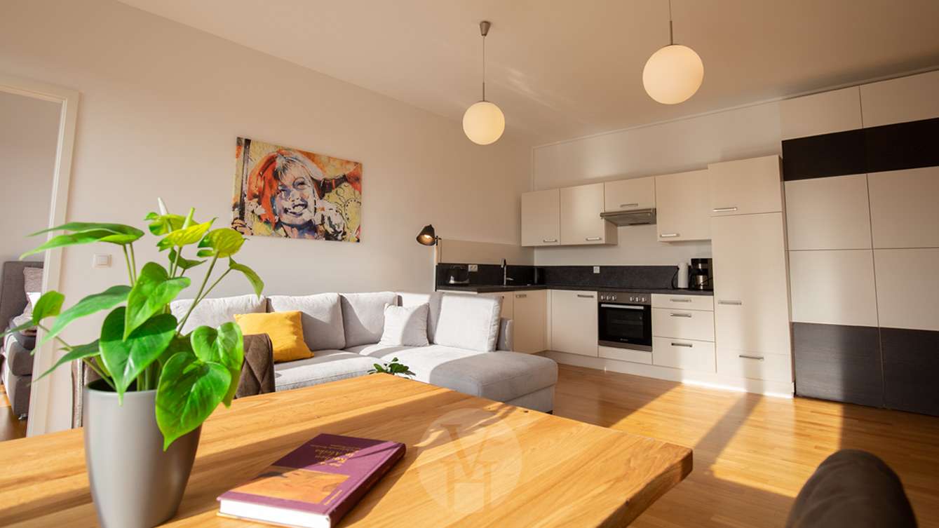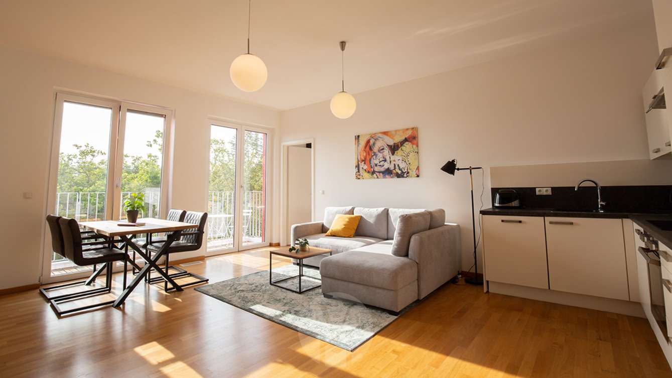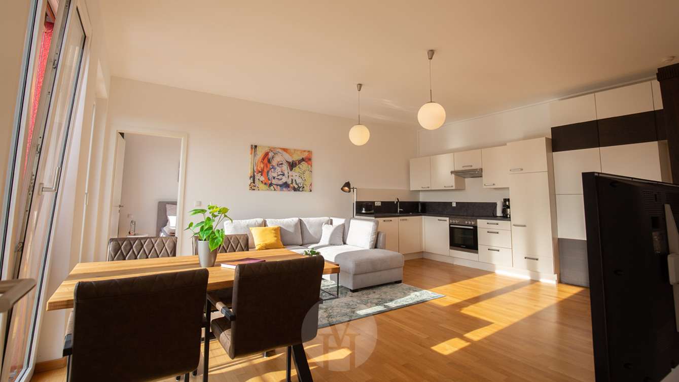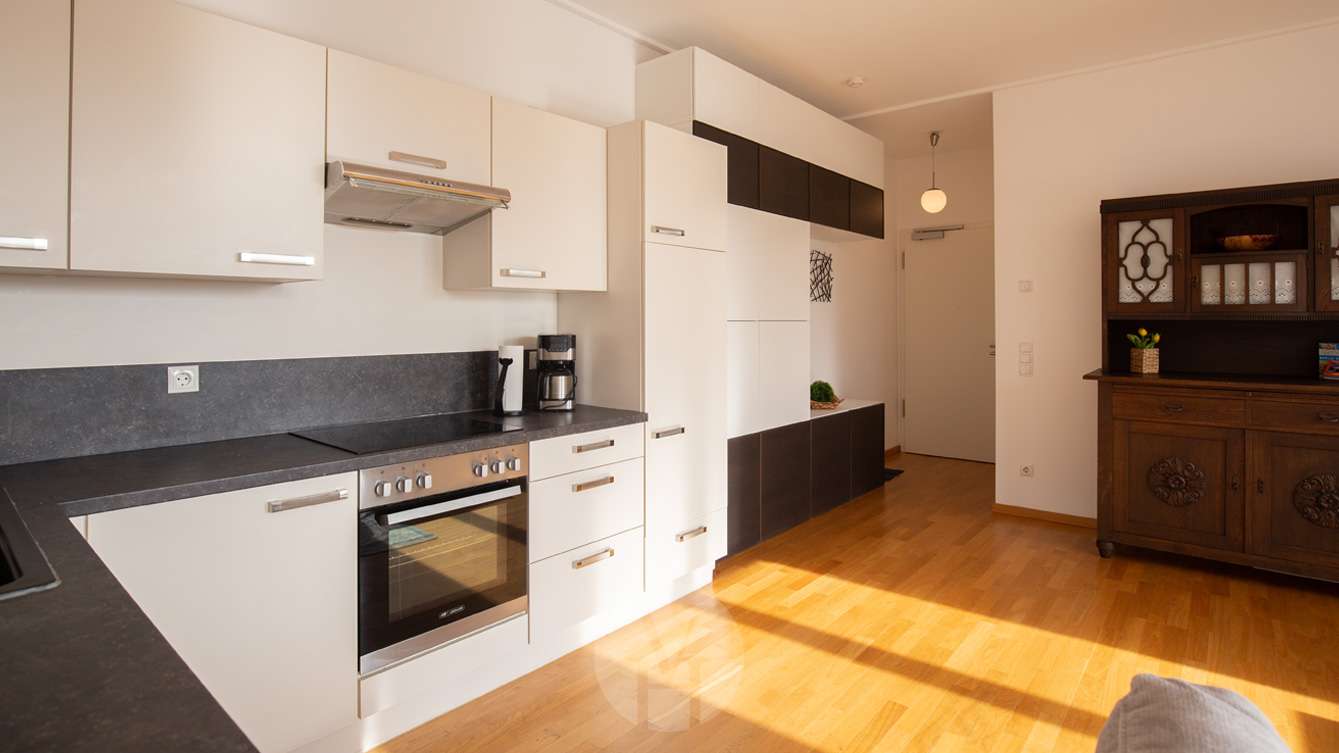Die offene Einbauküche fügt sich harmonisch in den Wohnbereich ein und schafft eine großzügige, moderne Wohn- und Esssituation.