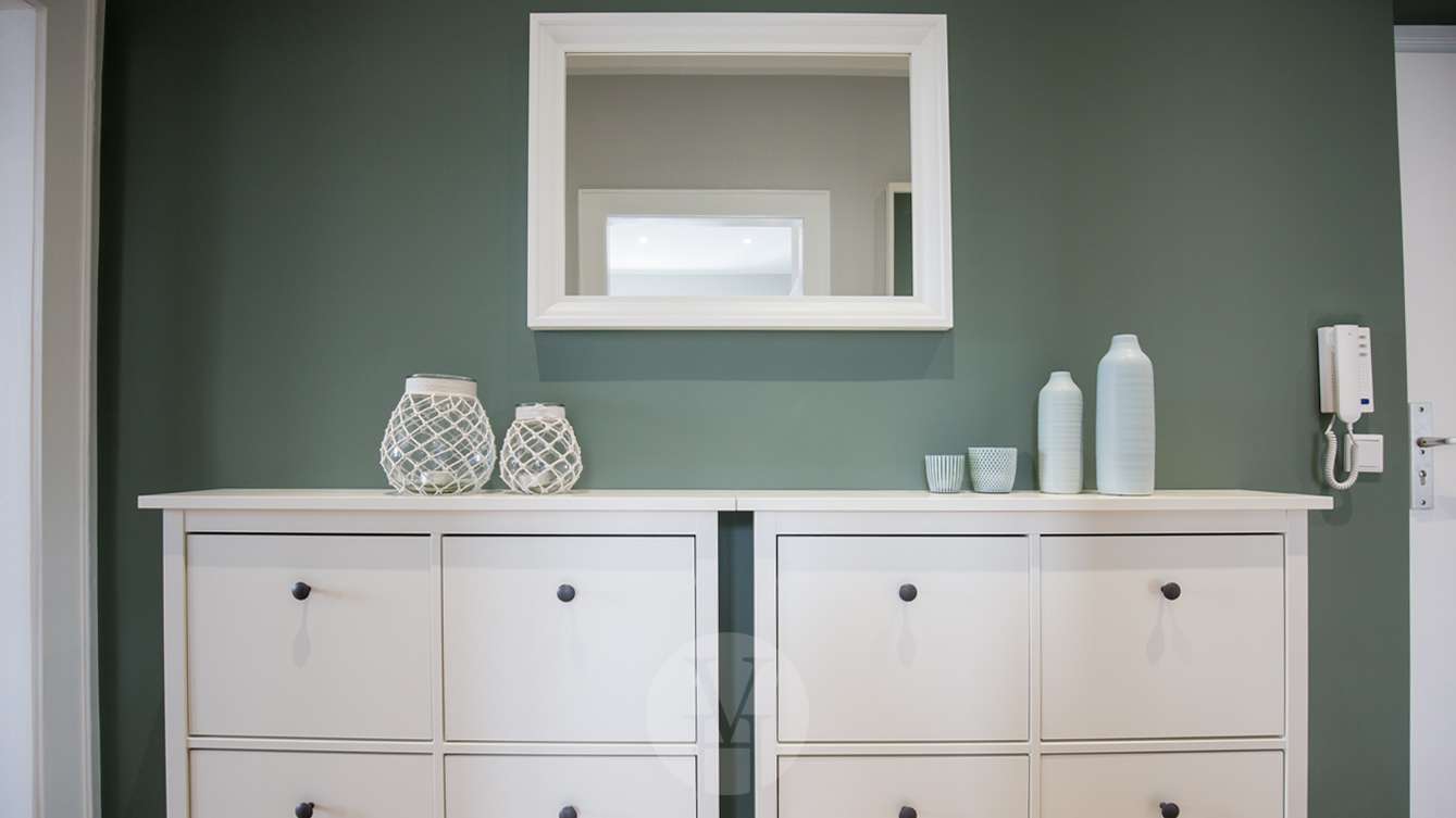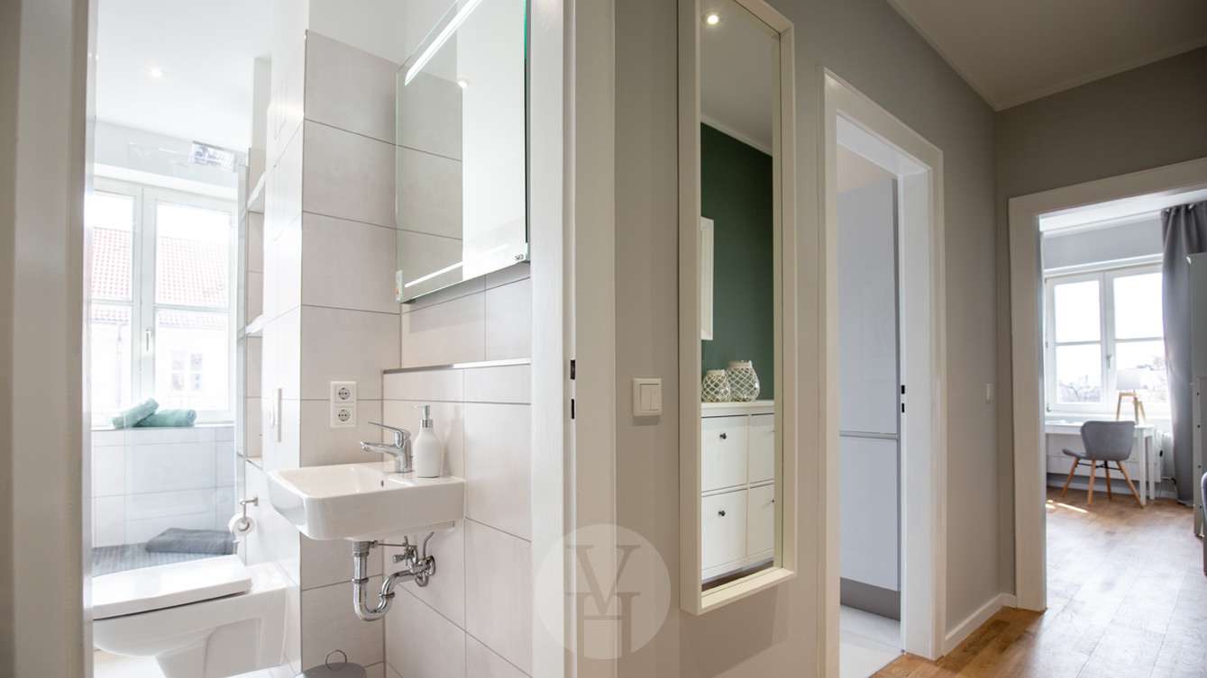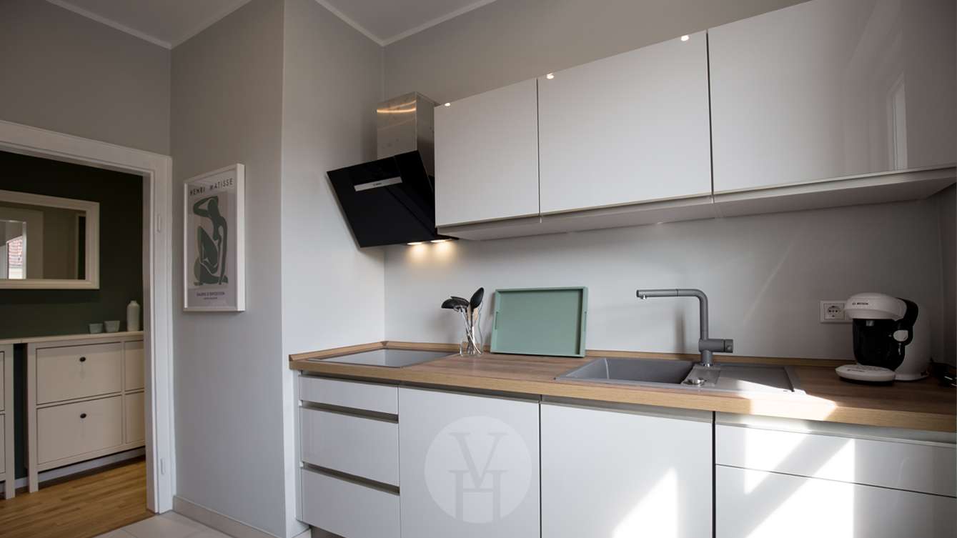 Die separate Küche bietet ausreichend Platz zum Kochen und hält den Wohnbereich angenehm frei. Ein praktischer Tisch lässt sich je nach Bedarf als Esstisch oder Schreibtisch nutzen und macht die Wohnung damit ideal für alle, die auch gelegentlich von zu Hause aus arbeiten möchten. Der Parkettboden verleiht den Räumen eine warme, wohnliche Atmosphäre und rundet das stimmige Gesamtbild ab.