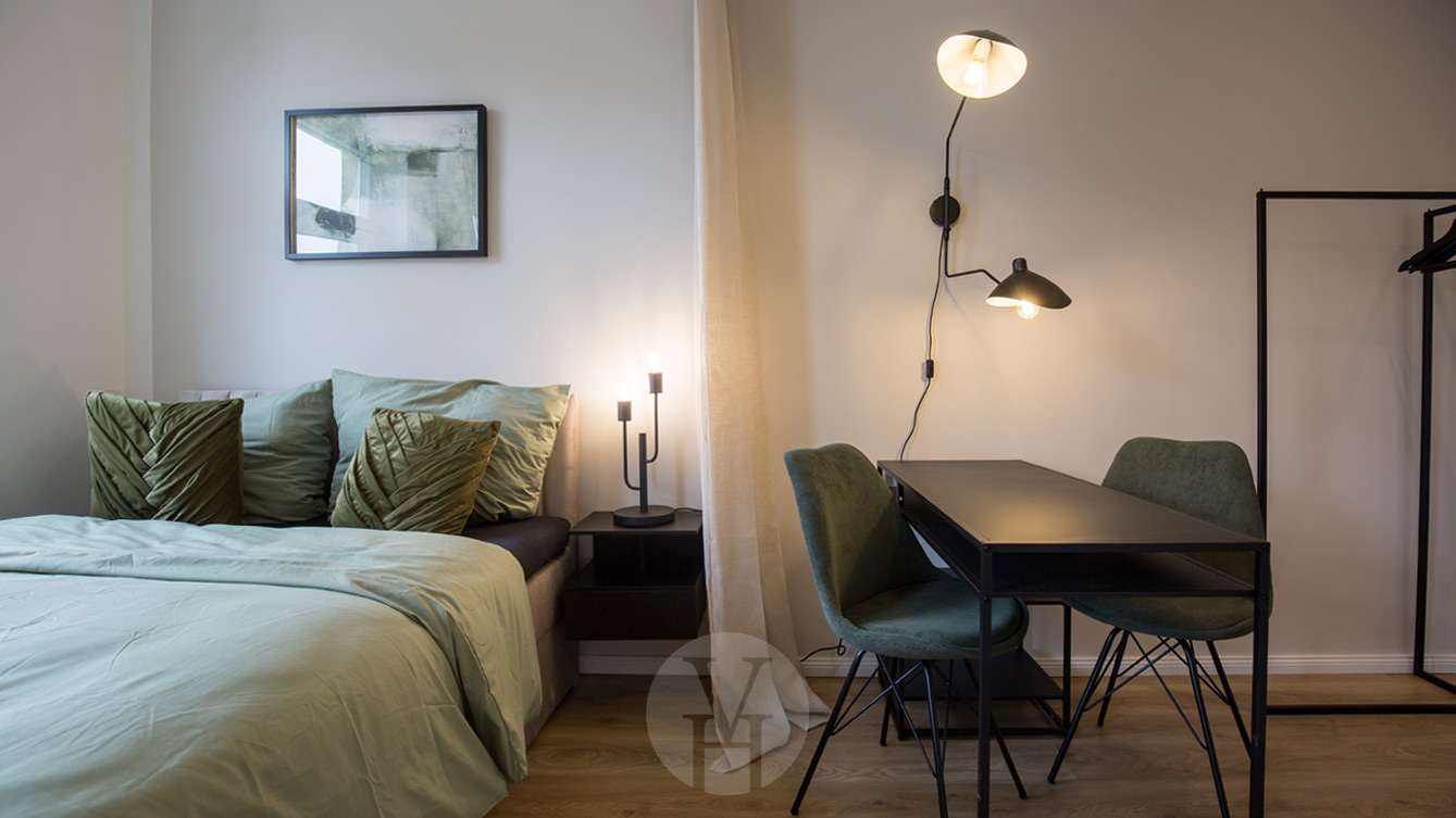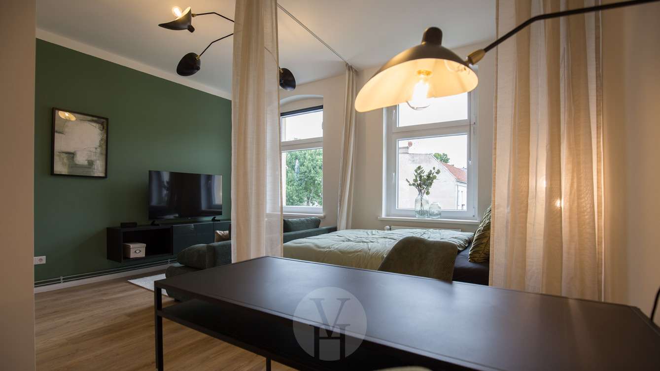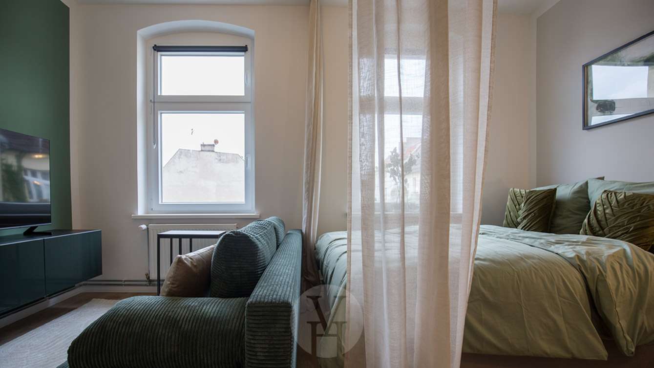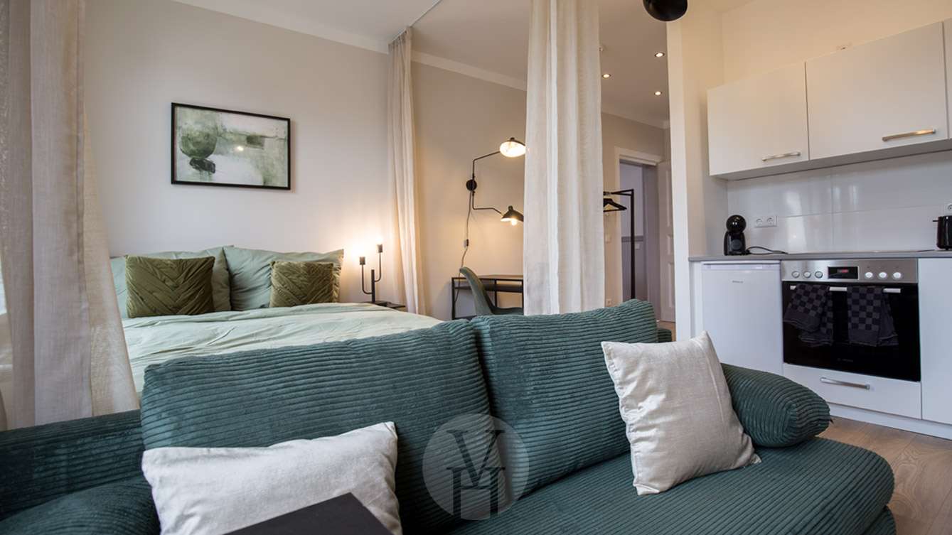 Das Besondere an der Wohnung ist ihre clevere Raumaufteilung: Ein halbtranspartner Vorhang trennt den Schlafbereich mit Bett dezent vom restlichen Wohnraum ab und schafft so eine gemütliche Rückzugsmöglichkeit. Eine Schlafcouch bildet den zentralen Wohnbereich und lädt zum Entspannen ein, während der Esstisch wahlweise auch als Schreibtisch genutzt werden kann – ideal für alle, die im Homeoffice arbeiten oder flexibel bleiben möchten.