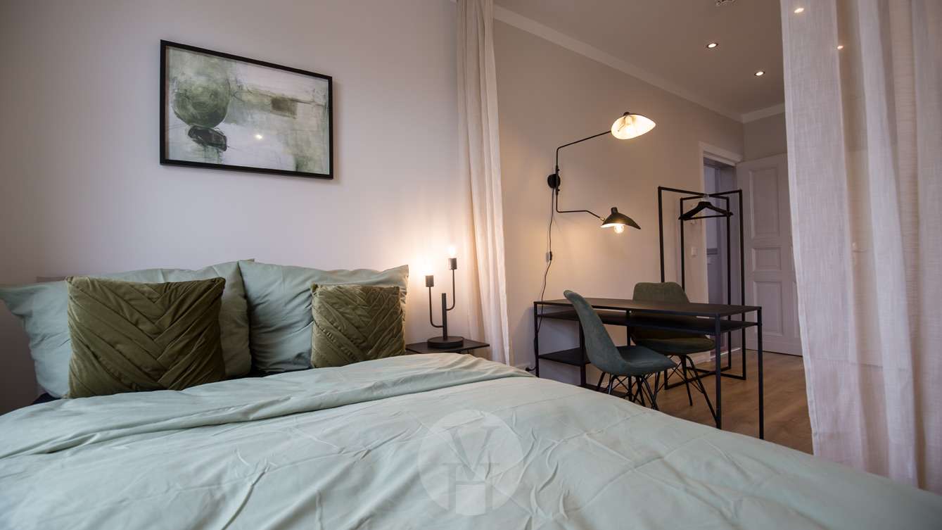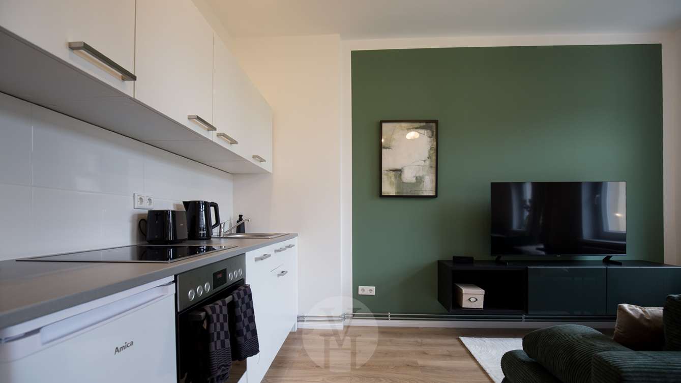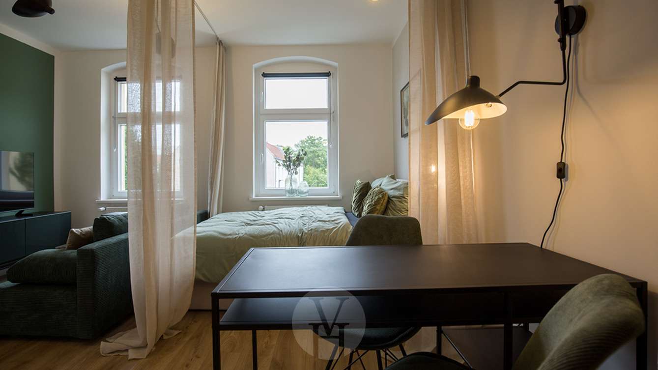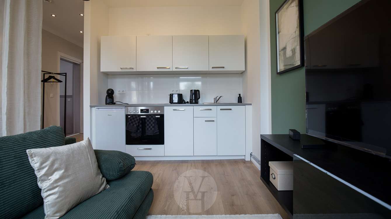 Das Besondere an der Wohnung ist ihre clevere Raumaufteilung: Ein halbtranspartner Vorhang trennt den Schlafbereich mit Bett dezent vom restlichen Wohnraum ab und schafft so eine gemütliche Rückzugsmöglichkeit. Eine Schlafcouch bildet den zentralen Wohnbereich und lädt zum Entspannen ein, während der Esstisch wahlweise auch als Schreibtisch genutzt werden kann – ideal für alle, die im Homeoffice arbeiten oder flexibel bleiben möchten.